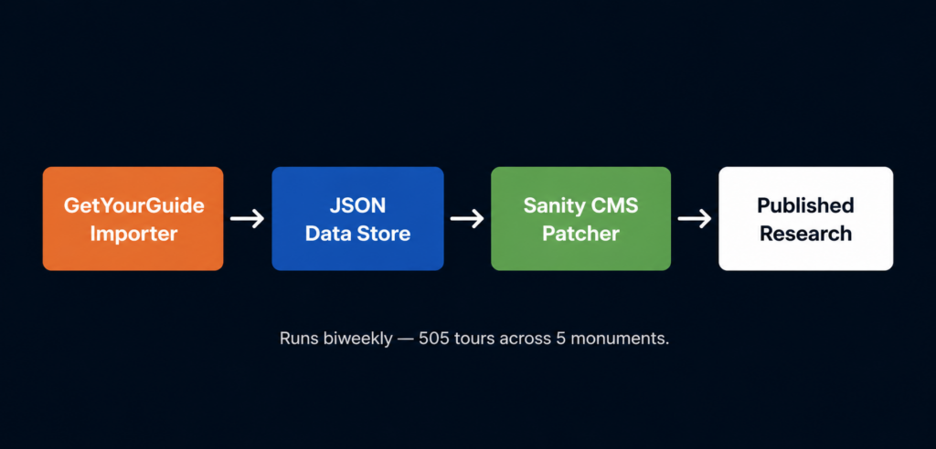 Layer 1: The Importer A custom Node.js script hits GetYourGuide’s listing pages for each of our five monuments and extracts structured data from every active tour product: title, price, currency, duration, rating, review count, operator name, product category, images, and description. The scraper runs as a cron job — on GitHub Actions for some sites, on a local scheduler for others — every Monday and Thursday at 6:00 AM UTC.