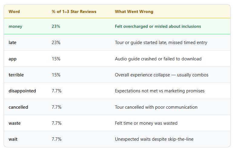 Look for small groups and specialist guides — not for high prices. The three perfect-score tours in our dataset share two traits: groups of 12 to 15 people and guides who are genuine experts (archaeologists, certified art historians). These traits exist at $58 and at $147. They do not require $300. The product design predicts satisfaction. The price tag does not.